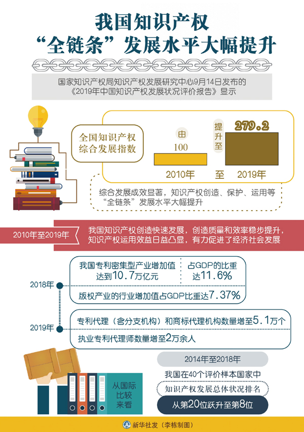 ——在完善法律法規(guī)方面,基本建立起符合國際通行規(guī)則、門類較為齊全的知識產權法律制度,實現了專利、商標、地理標志等知識產權的全方位、立體化保護。加入世貿組織以來,中國先后多次修訂專利法、商標法和著作權法等法律,基本形成了知識產權“嚴保護”的法律制度體系。